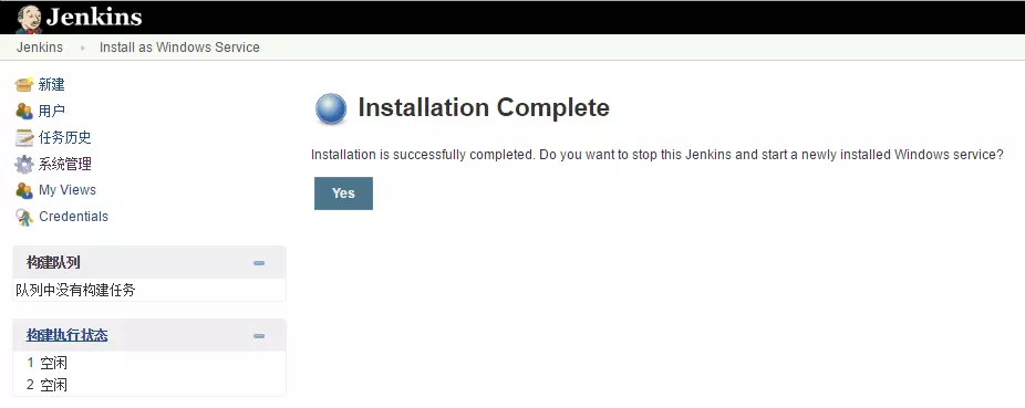 注意:如果 Jenkins 已经是做为一个服务运行,那么 Install as Windows Service 的链接不会出现。可以在系统服务中检查 Jenkins 是否已经做为一个服务运行。